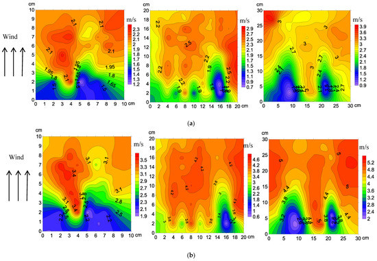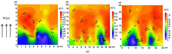 Flow fields for straw checkerboards of different side lengths and wind speeds: (a) 5 m·s−1, (b) 8 m·s–1, and (c) 11 m·s–1. Straw lengths from left to right are 10, 20, and 30 cm.