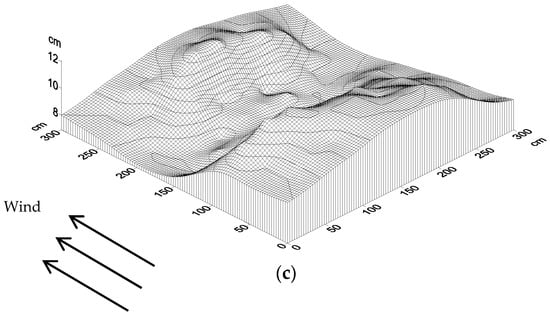 Generally, sand accumulating in the checkerboard forms a concave curved surface, as shown in Figure 6 for the straw checkerboards with side lengths of two and three meters. With a wind speed of 4.1 m·s−1, more sand accumulates in the deceleration area and less in the acceleration area. The sand carrying capacity of sand-driving wind is related to wind speed, such that when wind speed decreases, the sand carrying capacity of the sand-driving wind reduces, causing the sand to precipitate and deposit. In contrast, when wind speed accelerates, it blows along the sand surface, picking up and carrying sand. More sand accumulated in the grid of the one-meter-long straw checkerboard, and no concave surface formed. This occurred because the one-meter-long straw checkerboard had better sand accumulation capacity, thus it could intercept more sand grains. This phenomenon also reflects a deficiency in the straw checkerboard: although it offers protective effects, the duration of this protection period is short, after which it is easily buried by sand. In practical applications, the straw checkerboard should be supplemented regularly, or be used in conjunction with aerial sowing and shrub planting.