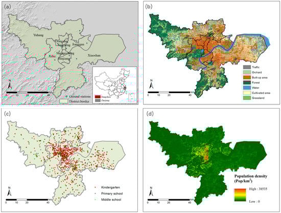 (a) Location of the study area and ground monitoring stations; (b) Land cover map of Hangzhou in 2015; (c) Spatial distribution of kindergarten, primary and middle schools in Hangzhou; and (d) Population density on 100 m × 100 m grid map.