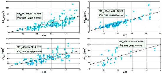 After AOT inversion and calibration, the linear regression models were successfully established between AOT and the PM2.5 concentration for the four seasons (Figure 3). Model correlations varied by season, with the correlation coefficient of determination (R2) varying between 0.347 and 0.740. The accuracy order of the model was determined as summer > spring > autumn > winter. This seasonal difference was affected by the height of the atmospheric mixing layer (i.e., low in autumn and winter when the diffusion of air particle pollutants was low). During autumn and winter, cold waves were frequent and the resulting weather conditions led to increasing atmospheric pollutants and greater spatiotemporal variability. The model fitting accuracy decreased. Nevertheless, the appeared acceptable for all four seasons [54].