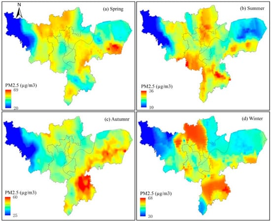 Spatial distributions of PM2.5 concentrations during four seasons in Hangzhou. (a) Spring; (b) Summer; (c) Autumn; (d) Winter.