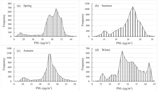 The histogram statistics of PM2.5 for the four seasons were also calculated. The distributions of PM2.5 in spring and autumn were relatively narrow, presenting a typical single peak distribution (Figure 5a,c). However, winter and summer showed dispersed values for PM2.5; these values were especially complex for winter, where there were multiple peaks (Figure 5b,d). This complexity was likely due to winter’s mixed atmospheric layer height being low and not conductive to the diffusion of atmospheric particle pollutants. In addition, cold waves frequently changed the weather conditions, which subsequently led to an increase in the spatiotemporal variability of atmospheric pollution and resulted in the regularity of distribution being less significant than that of spring and autumn [15,16]. Even in northern China, the distribution of PM2.5 was complex and contained multiple peaks during the winter [57,60].