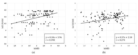 The results of the correlation analysis between the hazard scores calculated using the chemical ranking and scoring methods: (a) comparison between Mahalanobis distance (MD) and European Union Risk Ranking Method (EURAM) and (b) comparison between MD and Chemical Hazard Evaluation for management Strategies (CHEMS).