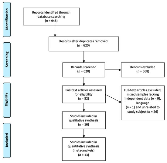 In total, 945 relevant studies were located. After reading the titles and abstracts, n = 568 records were excluded because they were not related to the study topic, the sample also included women, the study design was not appropriate for this review, or due to the language of publication. After reading the full texts, the final sample was n = 16 after eliminating duplicates and applying the inclusion and exclusion criteria. The search and selection process is described in Figure 1. The 37.5% were cohort studies and 50% were carried out in the United States of America. The characteristics of the studies and the HPV risk factors are summarized in Table 1.