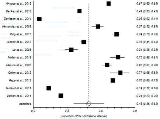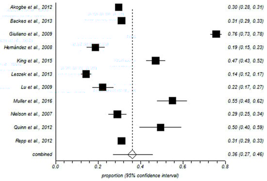 The meta-analytical estimation of the prevalence of any HPV in males was 49% with a 95% confidence interval of 35–62%. The forest plot is shown in Figure 2. Regarding the prevalence rate of high risk HPV the meta-analytical estimation was 35% with a 95% confidence interval of 26–45%. The forest plot is shown in Figure 3.