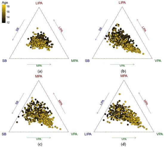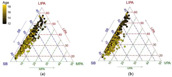 An exchange between LIPA and SB time as adolescents get older is apparent (Figure 1 and Figure 2). It is interesting to see some outliers towards VPA that might indicate intensive sport activities of adolescents. Even in the PA sub-composition, a similar trend can be observed.