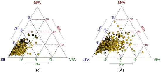 At first, the authors analyzed the inter-relationships between the parts that form the MB composition. The proportional relationships were summarized in the so-called compositional variation matrix, formed by the variances of all possible pair-wise log-ratios [] (Table 1). The lower the value of these variances, the more proportional the respective compositional parts are. Accordingly, Table 1 shows that SB and LIPA were the most proportional parts, while the least proportional pair was LIPA and VPA.
