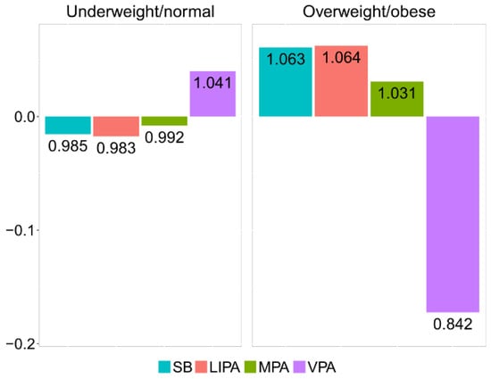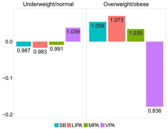 The relative difference between underweight/normal and overweight/obese groups can be visualized by the compositional mean barplot [] (Figure 4). The vertical axis values correspond to the log-ratios between the respective group centers and the overall center after data centering. The numeric labels of the bars inform about the relative differences with respect to the overall center. Thus, in the overweight/obese group, the proportion of time spent in VPA is reduced by 16.4% relatively to the overall center. Accordingly, VPA stands out as a key driver of the difference between the underweight/normal and overweight/obese groups, stressing on the lack of VPA time in overweight/obese adolescents.