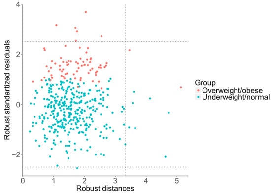 Moreover, using robust regression, it is possible to investigate the effects of outlying observations using a diagnostic plot of standardized residuals versus robust distances of the predictor variables [], as shown in Figure 6. Following Rousseeuw [], this enables us to distinguish three basic types of outliers: good leverage points, bad leverage points, and vertical outliers. Good leverage points are points (formed by response values and predictors) that are close to the regression plane; that is, good leverage points improve the precision of the regression coefficients. Bad leverage points are points that are far from the regression plane; that is, bad leverage points reduce the precision of the regression coefficients. Vertical outliers are outlying observations caused by the response, again negatively affecting the regression outputs. In this case, just one diagnostic plot (Figure 6) covers all four regression models due to mutual relationships between pivot coordinates. It can be observed that, although there are some good leverage points (middle right rectangular), bad leverage points (upper or bottom right rectangular) do not occur here. The vertical outliers (upper or bottom left rectangular) appear mostly in the overweight/obese group of adolescents, which indicates that this group has more outliers than the underweight/normal one, including some extremely obese adolescents. Despite the absence of bad leverage points, the presence of vertical outliers indicates possible differences between classical (LS) and robust regression models.