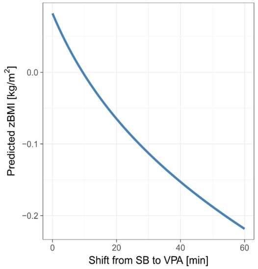 The graph in Figure 7 shows predicted zBMI for the mean MB composition (MM-estimates are considered) when re-allocating between 0 and 60 min from SB to VPA. We considered the total MB composition to stand for 16 h, assuming 8 h of sleep a day. The predicted zBMI associated with a 60-min SB-to-VPA re-allocation was reduced by 0.30. However, due to the small value of R2, the predictive power of these graph is rather limited.