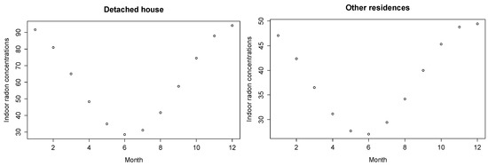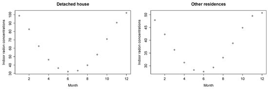 Using the monthly geometric mean of estimated indoor radon concentrations obtained from Equation (7), indoor radon and outdoor temperature in Korea were negatively correlated for detached houses and other residences (r = −0.88 and r = −0.72, respectively): it was weaker than a noted correlation in the UK []. The result could be explained by radon patterns in the spring and fall. In detail, the highest concentrations of radon are found in the winter, followed by the fall, spring, and summer. Meanwhile, the highest outdoor temperatures in Korea are recorded in the summer, followed by the fall, spring, and winter (Figure 3).