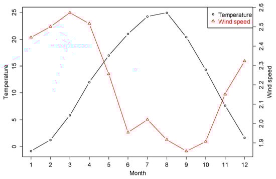 The monthly variations in outdoor temperature (°C) and wind speed ().