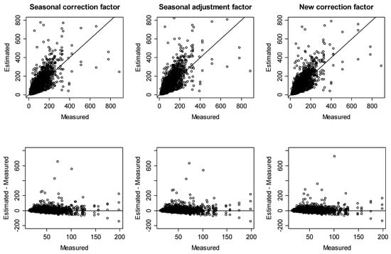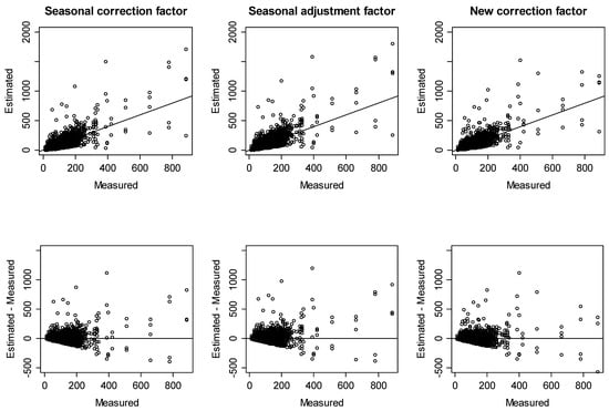 For other residences, roughly 85–87% of the estimated values were within ±40 Bq/m3 of the measured value for all correction factors. Specifically, there was a significant difference in that the seasonal correction factors and the seasonal adjustment factors had better agreement than the new correction factors within the difference limit of ±10 Bq/m3. However, there was no significant difference in agreement between the seasonal correction factors and the seasonal adjustment factors, compared to the new correction factors, within the difference limit of ±20 Bq/m3 or more. Thus, we could predict the mean annual radon concentration for other residences using Equation (2) and the seasonal correction factors or seasonal adjustment factors when indoor radon concentrations are measured for a specific season. Otherwise, we can use Equation (12) and the new correction factors.
