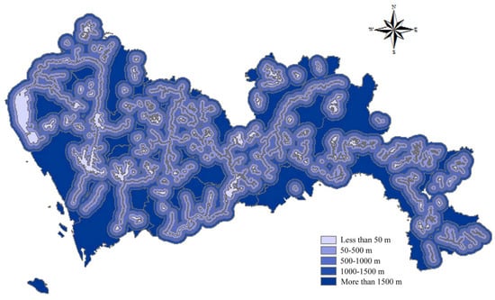 According to the Construction Standard for Municipal Solid Waste Landfills, landfills should be located far away from surface water and should be built in the downstream area if possible. More specifically, the Technical Code for Sanitary Landfilling of Domestic Waste stipulates that the distance between landfills and surface water should be larger than 50 m. Furthermore, according to China’s Solid Waste Management Law, the distance between the construction waste landfills and surface water shall not be less than 500 m. Based on the collected requirements, buffer zones were built around the surface water and scores were obtained according to the buffer distance. In this study, a buffer distance less than 50 m obtained 1 point; 50–500 m, 2 points; 500–1000 m, 3 points; 1000–1500 m, 4 points; and a distance more than 1500 m obtained 5 points. The spatial results of the distance to surface water are presented in Figure 1.