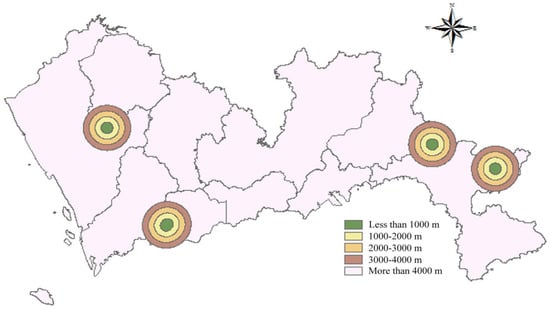 Nature reserves refer to the natural ecosystems and precious endangered animals and plants and other protected species in the area. There is a total of five nature reserves in Shenzhen. According to the Design Specifications of Landfills and Technical Code for Sanitary Landfilling of Domestic Waste, landfills should not be established in nature reserves and should be more than 1000 m away from the nature reserves. Therefore, buffer zones were set up at 1000 m around the nature reserves and scores were allocated according to the buffer distance. A buffer distance less than 1000 m was allocated 1 point; 1000–2000 m, 2 points; 2000–3000 m, 3 points; 3000–4000 m, 4 points; and a distance more than 4000 m obtained 5 points. The spatial results of the distance to nature reserves are presented in Figure 3.