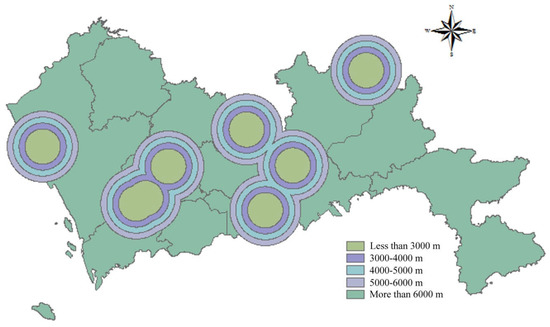 The Technical Code for Sanitary Landfilling of Domestic Waste stipulates that the distance from the airport to the landfill should be more than 3000 m. Distance between landfills and airports should be as far as possible, the score gradually increases with the increase of buffer distance. In this study, a buffer distance less than 3000 m derived 1 point, the ranges of 3000–4000 m, 4000–5000 m and 5000–6000 m were allocated 2 points, 3 points, and 4 points respectively. For a distance more than 6000 m, 5 points were given. Thus, the spatial results of distance to airport are represented in Figure 4.