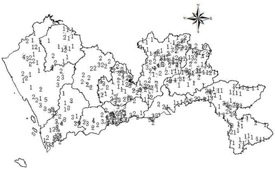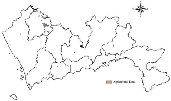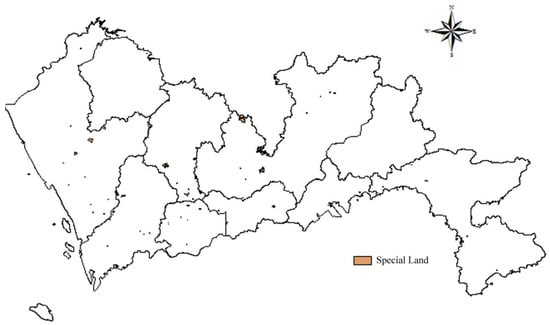 Special land includes military facilities, embassy sites, religious sites, teaching sites, tombs, etc. Agriculture land includes cultivated land, gardens, woodlands, pastures, and other agricultural productive building land. Special land and agricultural land are usually small in size, few in number, and scattered in the suburbs. The data of special land and agricultural land in Shenzhen are obtained through data screening. According to the Construction Standard for Municipal Solid Waste Landfills, landfills should not be constructed in the agricultural protection zone, worker-peasant planning zone, and other special protection zones. Thus, special land and agricultural land were allocated 1 point, and the spatial results of special land and agricultural land are shown in Figure 5 and Figure 6 respectively.