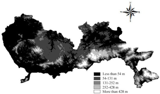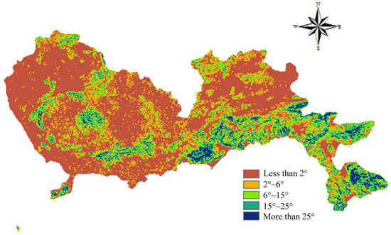 According to the Technical Specifications for Construction Waste Disposal and the Construction Standard for Municipal Solid Waste Landfills, the selection of construction waste landfill sites needs to take topography into consideration. In the Technical Regulations for National Land Use Status Survey, the slope of cultivated land is divided into less than 2°, 2°–6°, 6°–15°, 15°–25°, and more than 25°. A smaller slope is regarded as having a lower construction cost. Similarly, a lower altitude is regarded as having a lower construction cost. Therefore, the areas with a slope more than 25° were ranked 1 point while the areas with a slope less than 2° were allocated 5 points. The spatial results of slope are depicted in Figure 7. A similar scoring process was applied to altitude, and the corresponding results are shown in Figure 8.