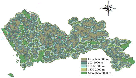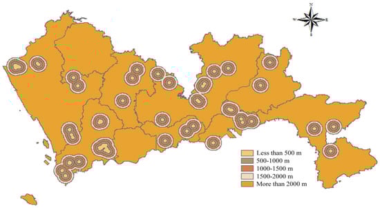According to the Technical Specifications for Construction Waste Disposal, the Construction Standard for Municipal Solid Waste Landfills, and the Technical Code for Sanitary Landfilling of Domestic Waste, construction waste landfills have a certain impact on the urban environment and landscape. There should be a certain protection distance between landfills and scenic areas, tourist areas, and cultural relics. Thus, all scenic spots, such as cultural attractions, natural attractions and historical relics, should be as far as possible from the landfills. In this study, the buffer with a distance less than 500 m received a score of 1; the buffer with a distance of 500–100 m, a score of 2; the buffer with a distance of 1000–1500 m, a score of 3; the buffer with a distance of 1500–2000 m, a score of 4; and the buffer with a distance greater than 2000 m received a score of 5. The spatial results of cultural attractions, natural attractions, and historical relics are shown in Figure 9, Figure 10 and Figure 11 respectively.