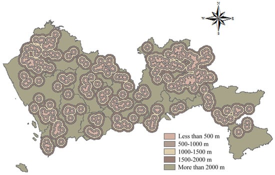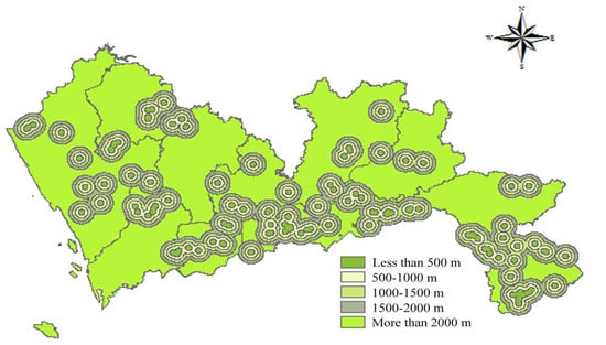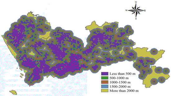 According to the Construction Standard for Municipal Solid Waste Landfills and the Technical Code for Sanitary Landfilling of Domestic Waste, the impacts of landfills on residents and the surrounding environment should be considered. It is stipulated that the distance from landfills to residential sites should be greater than 500 m. Therefore, buffers were set around urban settlements and rural settlements. A buffer with a distance less than 500 m was allocated a score of 1; a buffer with a distance of 500–1000 m, a score of 2; a buffer with a distance of 1000–1500 m, a score of 3; a buffer with a distance of 1500–2000 m, a score of 4; and a buffer with a distance greater than 2000 m received a score of 5. The spatial results of urban settlements and rural settlements are shown in Figure 12 and Figure 13 respectively.