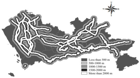 According to the Construction Standard for Municipal Solid Waste Landfills, Pollution Control Standards for Landfills, and Technical Code for Sanitary Landfilling of Domestic Waste, landfills should locate in areas with convenient transportation and reasonable distances and should have a reasonable positional relationship with trunk roads, highways, railways, etc. A shorter transportation distance can lead to lower transportation cost. The main roads in Shenzhen were screened from Shenzhen Road Network data. A buffer with a distance less than 500 m obtained a score of 1; a buffer with a distance of 500–1000 m, a score of 2; a buffer with a distance of 1000–1500 m, a score of 3; a buffer with a distance of 1500–2000 m, a score of 4; and a buffer with a distance of more than 2000 m was given a score of 5. The spatial results of distance to main road are shown in Figure 14.