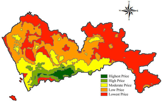 Land price can influence the selection of landfill sites. Normally, the land price for establishing landfills should be low to reduce construction cost. According to the Shenzhen City Planning and Land Resources Committee, the latest land prices are divided into five categories. Therefore, the land with the highest price received a score of 1 and the land with the lowest price, a score of 5. The spatial results of land price are shown in Figure 16.