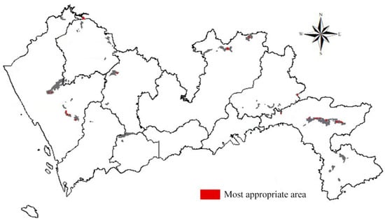 After the overlay analysis, the most appropriate areas for establishing construction landfills were derived, as shown in Figure 17. According to Figure 17, the most suitable area is 7,652,163 m2, accounting for 0.38% of the total area. The area that is suitable for the construction waste landfills is 351,123,966 m2, accounting for 17.58% of the total area. From Figure 17, it can be seen that the distributions of the most suitable area and the suitable area are very scattered.