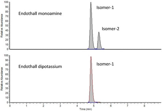 It is known that endothall exists as a mixture of three stereoisomers of which the (1R,2S,3R,4S)-isomer is the most herbicidally active [32]. The number and identity of isomers in endothall herbicide formulations have never been reported to our knowledge. Two isomers of endothall were detected in this study. Isomer-1 was dominant in both endothall formulations, while isomer-2 was present in substantial amounts in monoamine endothall but at trace levels in dipotassium endothall (Figure 1). The differences in isomer composition between these two formulations have not been described before.