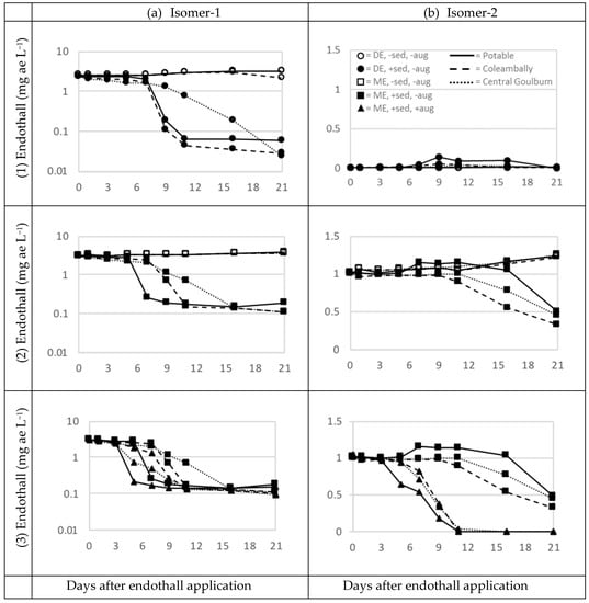 Endothall isomer-1 (a) and isomer-2 (b) concentrations in mesocosms for each treatment. Values represent average over three replicates. Plots represent various combinations of endothall formulation, source of water and sediment, presence or absence of sediment, and microbe augmentation. Note different y-axis scales between left and right panels. (1) Treatments containing dipotassium endothall without microbe augmentation. (2) Treatments containing monoamine endothall (without microbe augmentation). (3) Treatments containing monoamine endothall with sediment, ±microbe augmentation. Note: a subset of treatments is shown in both (2) and (3). Legend provided in top right panel: Water sources represented by line style; endothall form (DE = Dipotassium endothall, ME = Monoamine endothall), sediment presence or absence (±sed) and pre-exposure to endothall (±aug), represented by shape and full of symbols.