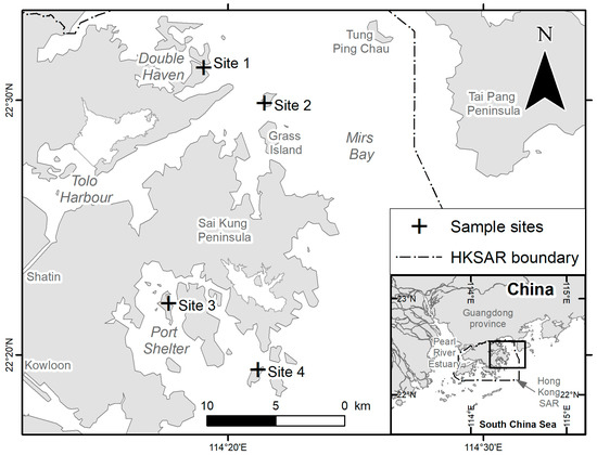 Hong Kong is a megacity with a population of more than seven million people. It is located on the eastern shore of the Pearl River Estuary in China (Figure 1). The city itself as well as the Pearl River are the two major sources of microplastic pollution in Hong Kong [12,31]. Influenced by the freshwater discharge from the Pearl River, the waters in western Hong Kong are estuarine and turbid, rendering the area sub-optimal for coral growth. In contrast, marine waters along the eastern and northeastern shores are protected by natural shelters and are almost unaffected by discharge from the Pearl River. Therefore, corals in Hong Kong are primarily distributed in this region [32].