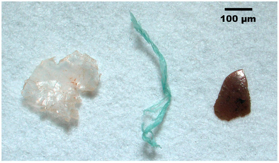 Under a dissecting microscope (Olympus, Tokyo, Japan) at 40× magnification, the identifiable microplastics were collected and added to a watch glass using a pointed tweezer, according to the criteria set by Norén [14]: (1) absence of cellular or organic structures; (2) colours are homogeneous and distinct; (3) if it is a fibre, it is equally thick and does not taper to the ends. Additionally, it has a three-dimensional bending, instead of a completely straight shape. (4) For transparent or whitish pieces, extra examination should be carried out under a microscope with high magnification to rule out an organic origin. According to Cheung, et al. [31], the identifiable microplastics (diameter 0.3–5 mm) were sorted into five groups: (1) expanded polystyrene (EPS); (2) fibre (FB); (3) film (FL); (4) hard fragments (FM); and (5) pellets (PL).
