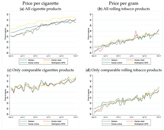 However, trends in prices of comparable products (that is, products listed in all datasets) were very similar in all datasets (Figure 1c,d) and average prices slightly higher, indicating that differences in overall average prices are likely to be attributable to differences in the range of products for which data are available in each dataset, with a relatively high proportion of low-price (particularly packs of 10–19 cigarettes) in the Kantar data.