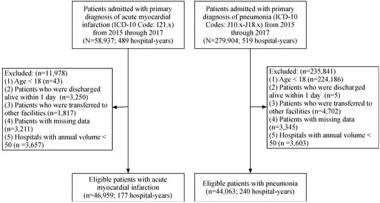Using the ICD-10 of principal diagnosis with variations in the three digits after the decimal point, we extracted a sample of AMI (ICD-10: I21.x) and pneumonia (ICD-10 codes: J10.x-J18.x) patients who were over 18 years old and admitted between 2015 and 2017. The sampling process is displayed in Figure 1. We excluded patients who were discharged alive within 1 day after admission because they were likely to leave against medical advice and the treatment time was very limited. Patients with missing data such as age, gender, admission status, insurance, and discharge status were also excluded. In addition, we excluded patients who were transferred to another hospital or community health service center because their admissions were truncated and subsequent treatment information in other facilities was unavailable for our study. Furthermore, we dropped hospitals with fewer than 50 cases annually to prevent one death case from unduly affecting the hospital mortality rate, which would lead to measurement error in the quality measures. while some very small volume hospitals were excluded, the hospitals included represented most of the hospital care provided to a majority of residents in Shanxi. A total of 46,959 hospitalizations for AMI and 44,063 hospitalizations for pneumonia were included in our analyses.