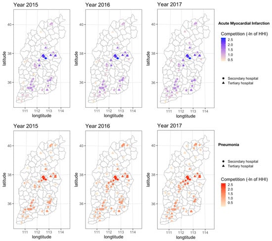 Geographical distribution of hospital competition for acute myocardial infarction and pneumonia in Shanxi, 2015–2017.