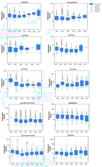 Potatoes, vegetables, grains, beans, fruits (except in 2011) have consistently averaged <50 Bq/kg, below the regulation limit, each year. In addition, the number of outliers and the maximum values of these categories have shown a steady decrease since 2012.