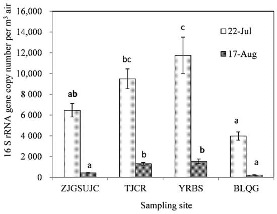The abundance of airborne bacteria was estimated by the quantification of the number of 16S rRNA gene copies. Airborne bacteria from four selected sampling sites before and after a period of extreme heat were quantified by total DNA extracts. The standard curve was linear from 2 × 100 to 2 × 105 gene copies per reaction (r2 = 0.998). Averages of 7.9 × 103 and 8.8 × 102 bacterial 16S rRNA gene copies per m3 of air were determined on 22 July 2013 and 17 August 2013, respectively, and significantly higher 16S rRNA gene copy numbers were detected after the heat event (p < 0.01) (Figure 2). The bacterial 16S rRNA gene copy numbers were approximately 6.5 × 103, 9.5 × 103, 1.2 × 104, and 4.0 × 103 per m3 of air at the sampling sites of ZJGSUJC, TJCR, YRBS, and BLQG, respectively, at the start of the heat event. At the end of the heat event, bacterial 16S rRNA gene copy numbers were approximately 4.4 × 102, 1.3 × 103, 1.5 × 103, and 2.3 × 102 per m3 of air at the sampling sites of ZJGSUJC, TJCR, YRBS, and BLQG, respectively. Taken together, 16S rRNA gene copy numbers at the selected four sampling sites were significantly higher before the heat event (p < 0.01).