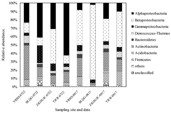 Overall, we observed that the air samples collected on prior to the heat event (22 July 2013) were dominated by Proteobacteria (67.1%), Actinobacteria (18.4%), Deinococcus–Thermus (4.1%), Firmicutes (3.7%), and Bacteroidetes (2.8%). In contrast, the predominant bacterial phyla of the samples collected after the heat event (17 August 2013) were Proteobacteria (65.1%), Actinobacteria (15.1%), Firmicutes (9.9%), Deinococcus–Thermus (3.9%), and Bacteroidetes (2.9%). Compared to the samples before the period of extremely high temperature, the proportion of Proteobacteria, Actinobacteria, and Deinococcus–Thermus decreased slightly, while the proportion of spore-forming bacteria such as Firmicutes increased significantly. We also found that the proportion of alpha-Proteobacteria and gamma-Proteobacteria was significantly higher on before the heat event (p < 0.01), while the proportion of beta-Proteobacteria was significantly lower (p < 0.01). The abundances of alpha-, beta-, and gamma-Proteobacteria were 39.6%, 18.2%, and 9.3% before the heat event, and changed to 9.8%, 50.3%, and 5.0% after the heat event, respectively (Figure 4).