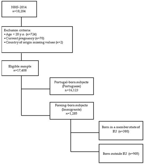 Data used in this study come from the National Health Survey (NHS) 2014, the fifth in Portugal since 1987, promoted by the Health Ministry [28]. The NHS 2014 was conducted by the Statistics Portugal Institute (INE) in collaboration with the National Institute of Health Doctor Ricardo Jorge [29]. The microdata database used for the present study was provided under protocol between INE, Directorate-General for Education and Science Statistics (DGEEC), and the Foundation for Science and Technology (FCT). The NHS 2014 is a population-based survey and collected information from the resident population aged 15 and over, on self-assessment health status, health care, and determinants related to lifestyles. This survey followed methodological guidelines and practices regulated at EU level (Commission Regulation (EU) No 141/2013), in order to enable an international comparison of the results. National questions were also included, with a view to obtaining data on relevant issues for characterising the population health status (namely reproductive health, food consumption, satisfaction with life, and long-term disability). INE carried out for the first time the collection of data on the Internet, from a sample survey of households and individuals. Results from the NHS 2014 correspond to estimates of residents, regardless of their nationality or migrant status, in the whole country between September and December 2014. This population-based survey included a total of 22,538 family housing units and the interview completion rate was 80.8% nationwide. The main methodological and conceptual features used in the NHS 2014 have been previously described elsewhere [30]. This study was reported according to the STROBE checklist for observational studies in epidemiology (Supplementary file 1) [31]. Country of birth was used to determine immigrant population and only the adult population, aged 20 and over, was consider for the present study. The final sample size comprised 17,410 participants of whom 7.4% were immigrants (Figure 1).