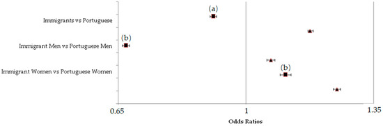 For Model 1, unadjusted results revealed that being an immigrant was positively associated with adequate F&V intake (OR = 1.18, 95% CI = 1.17–1.18), especially for women (OR = 1.25, 95% CI = 1.24–1.26). However, for the adjusted model, association between migrant status and recommended F&V consumption was only evident for men: immigrants were less likely to achieve an adequate fruit and vegetable intake (OR = 0.67, 95% CI = 0.66–0.68), when compared to Portuguese (Figure 2).