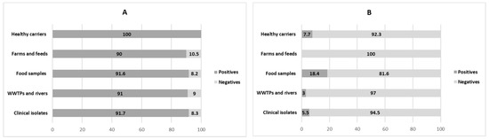 It should be noted that intI2 was mainly detected in food isolates (18.4%), but not in farming environments (p = 0.044). This situation seems a little bit contradictory, but it could be due to the low number of isolates coming from farms and feed (n = 20), compared with food (n = 48). Probably, if we extended the study by increasing n, we would find positive results for this type of integron, as shown in the literature. In any case, our results are comparable to those obtained by Goldstein et al. [42], who demonstrated the presence of class 1 and class 2 integrons in food, livestock, and water contaminated with farm animal feces. In a similar way, intI2 has been detected in poultry products [38].
