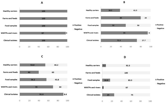 Prevalence (percentages) and distribution of insertion sequences in ESBL-producing E. coli according to their origin. (A) IS26; (B) ISEcp1; (C) IS903; (D) ISCR1.