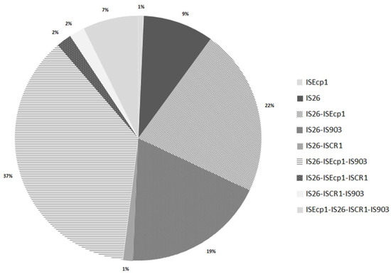 In addition, the frequent co-existence of several insertion sequences in the same strain has been detected, in agreement with other studies [25,26,27,47]. Genetic patterns are presented in Figure 3, showing that the majority of isolates carried two or three IS (42% and 40.7%, respectively), whereas 10% of them carried only one. The three prevalent genetic patterns were IS26–ISEcp1–IS903 (n = 55), IS26–ISEcp1 (n = 33), and IS26–IS903 (n = 28) (37%, 22%, and 19%, respectively). The combination IS26–ISEcp1 has been related with the pathogen clone ST131 [25,48], and it was present in 4 isolates coming from healthy people (n = 2) and hospital inpatients (n = 2), that supposes a possible risk situation for the healthy population. Finally, it is remarkable that 7.3% of isolates contain the four IS (ISEcp1–IS26–IS903–ISCR1), a situation that, to our best knowledge, is being described in the literature for the first time. These isolates come mainly from hospital inpatients (n = 9), but we also found the genetic patterns in isolates from a river (n = 1) and from a chicken hamburger (n = 1). In summary, these results show the complexity of mobile genetic elements, and suggest the facility to acquire different mechanisms to disseminate resistance genes through all environments.