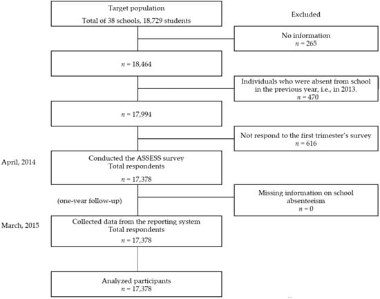 A longitudinal design with a one-year follow-up period was used in this study. Baseline questionnaires were distributed to students in the seventh to ninth grades at 38 junior high schools in Okayama Prefecture in western Japan at the beginning of the 2014 academic year. The baseline questionnaire was distributed to a total of 18,729 students. The teachers at each school collected the questionnaires from the students and sent the questionnaires to the researchers. As a result, 17,378 students responded to the questionnaire. Twelve months later, information on each student’s absences was collected from each school according to the record at the end of the 2014 academic year. Each student was assigned an identification number only for the purpose of this study. We linked the baseline data of the questionnaires and absenteeism data using Excel (Microsoft Office 2013, Microsoft, Tokyo, Japan).