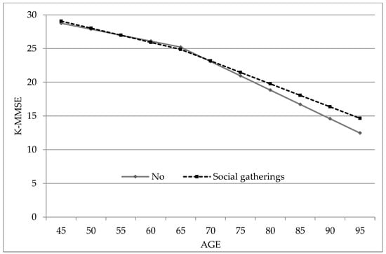 Among women, MMSE scores decreased with increasing age at a rate of approximately 0.18 units. The decline in scores was steeper for those aged older than 65. At baseline, social activity of any type was not related to MMSE score. In addition, baseline social activity was not related to the decline in MMSE score in individuals younger than 65. Participation in social gatherings contributed to preserving the decline of MMSE scores (β = 0.118, p = 0.011), whereas religious activities, alumni/clan gatherings, and volunteer work did not exhibit significant relationships with the decline of MMSE scores in individuals older than 65. In other words, social gatherings were likely to delay the decline of cognitive function among women older than 65 (Table 2). Further, Wald tests on the interaction terms in the pooled samples revealed significant interaction effects based on gender (p = 0.027). Figure 1 presents the change in K-MMSE scores based on age among women who participated in social gatherings, which was estimated using the regression model.