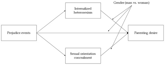 Informed by MST, we first hypothesized that prejudice events could be negatively associated with parenting desire and, based on previous Italian studies highlighting the heteronormative social context for Italian LG individuals [20,38,39,40,41,42], that this association might be stronger in childless lesbian women than in childless gay men (Hypothesis 1). Second, informed both by the PMF and previous Italian studies [20,38,39,40,41,42], we hypothesized that the most subjective minority stressors (i.e., sexual orientation concealment and internalized heterosexism) would be negatively linked to parenting desire, with a stronger effect in lesbian women (Hypothesis 2). Third, informed by the PMF, we expected that both sexual orientation concealment and internalized heterosexism would act as mediators between prejudice events and parenting desire, and that these indirect effects would be dependent on an individual’s gender (woman vs. man) (Hypothesis 3). Finally, as sociodemographic factors might influence both minority stressors and parenting desire [3,11,46,47], we considered the possible confounding effect of the following dimensions, age, education level, political orientation, and having a partner.