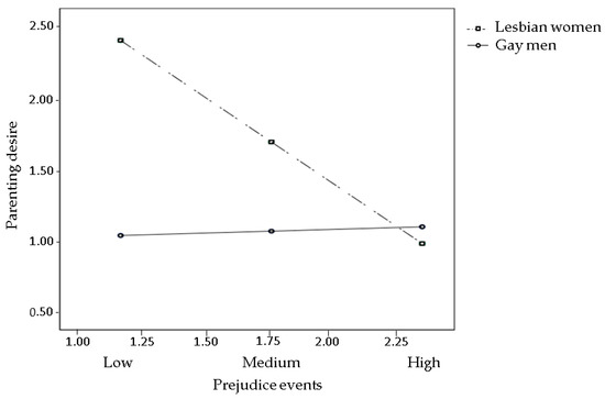 Interaction between prejudice events and gender on parenting desire. Estimated log odds of parenting desire are reported for combinations of prejudice events (low, medium, and high) and individual’s gender (lesbian women vs. gay men).