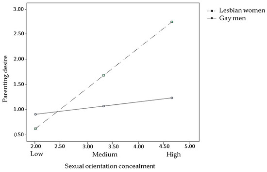 Interaction between sexual orientation concealment and gender on parenting desire. Estimated log odds of parenting desire are reported for combinations of sexual orientation concealment (low, medium, and high) and individual’s gender (lesbian women vs. gay men).