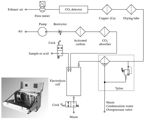 The DOC decomposition cell was constructed according to previous study results [15]. An electrode gap of 0.3 cm and a sample volume of 7 mL were used, which resulted in an active electrode surface of 23.33 cm2. The cell was run in galvanostatic mode with a current of 4 A, which led to an internal carrier gas volume of 45 mL min−1. The electrolytic cell was installed in a portable prototype constructed together with Elektrochemie Halle GmbH, Germany, see Figure 1. The portable prototype was set up in an aluminum suitcase with an external power connection. With a consumption of around 60 Wh, a battery power supply is also possible.