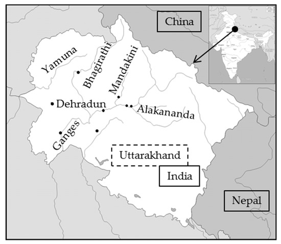 To prove the suitability of the prototype as a portable DOC analyzer, it was used during an environmental monitoring program on the water quality in Northern India. Overall, around 100 samples were taken from different sites and rivers in Uttarakhand, see Figure 2, during two sampling campaigns in October 2016 and October 2017. The water samples were taken from rivers and canals as well as from riverbank filtration and groundwater wells. All samples were filtrated (Chromafil® GF/PET-45/25; Macherey-Nagel, Düren, Germany), acidified (pH 1.4, H2SO4, Merck, Darmstadt, Germany) on-site and shortly thereafter measured using the portable prototype. A comparative sample was taken, filtrated, acidified using HCl (pH 1.4, Merck, Darmstadt, Germany), refrigerated, and measured with a TOC-5000 (Shimadzu, Kyoto, Japan) as described above.