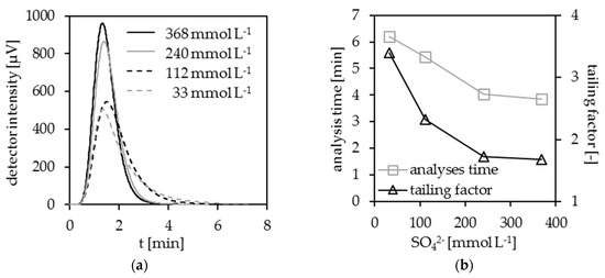 Considering the possible generation of SO4−• radicals, their longer lifetime, and the described decomposition mechanism, it can be assumed that the concentration of SO42− added to the electrolyte has a significant impact on the efficiency of the DOC decomposition. For this reason, the complete DOC decomposition in dependence on the SO42− concentration was investigated. The pH was kept constant at 1.4, and the sulfate concentration was varied between 33 and 368 mmol L−1. Figure 4 demonstrates that the sulfate concentration has a significant influence on the peak shape, the tailing factor, and the analysis time. The tailing factor decreases with increasing sulfate concentration from 3.4 to 1.7. The results for 240 and 368 mmol L−1 sulfate differ only slightly, whereas a significant deterioration occurs when 112 mmol L−1 sulfate is used instead of 240 mmol L−1. This is valid for the duration of the analysis, see Figure 4b. This proves the dependence of the DOC decomposition on the sulfate concentration. It also points to another, sulfate-based oxidant species, which is formed in addition to •OH radicals.